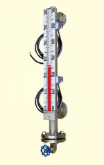 控制型是在翻柱液位計的基礎(chǔ)上增加了磁控開關(guān),在監(jiān)測液位的同時磁控開關(guān)信號可用于對液位進行控制或報警;遠傳型是在翻柱液位計的基礎(chǔ)上增加了 4~20mA 變送傳感器,在現(xiàn)場監(jiān)測液位的同時將液位的變化通過變送傳感器、線纜及儀表傳到控制室,實現(xiàn)遠程監(jiān)測和控制。